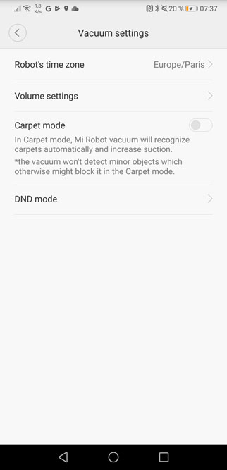 Je peux également ajuster le volume des annonces vocales du robot et activer le mode tapis (l’aspiration augmentera automatiquement).