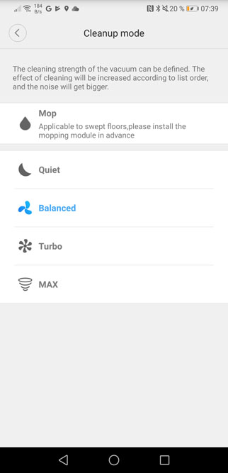 Il existe 4 niveaux d’aspiration : Quiet, Balanced, Turbo et Max. Pour les tests qui suivent j’ai choisi la puissance « balanced » qui est l’aspiration par défaut.