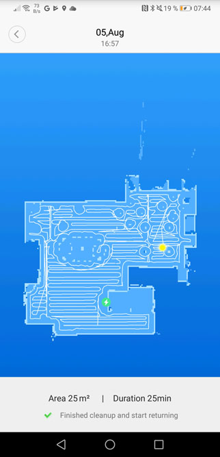 Comme vous le constaterez dans la vidéo du test, le robot réalise 2 passages car la surface à nettoyer est réduite à quelques m2. J’avais déjà constaté cela sur les derniers robots aspirateurs testés.