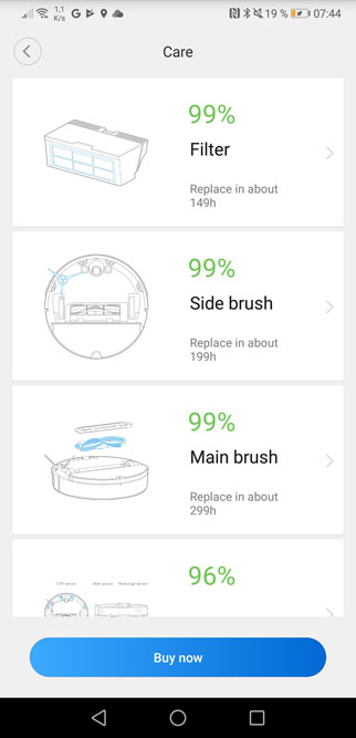 Le robot donne également une estimation du nombre d’heures avant entretien ou changement d’un accessoire :