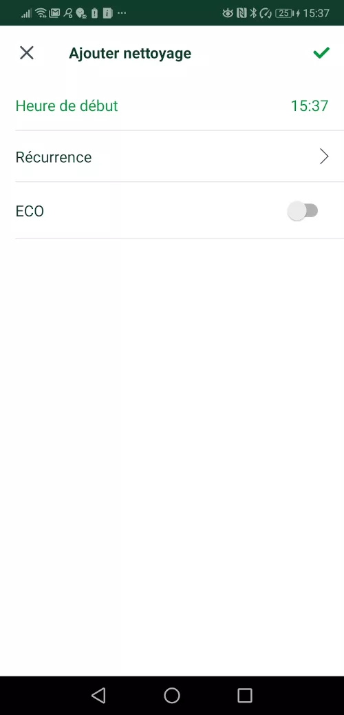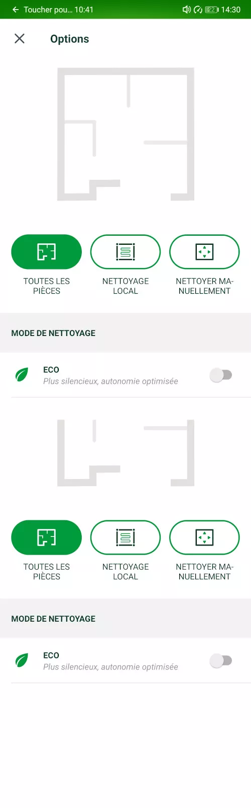 L’application permet d’opter pour 3 types de nettoyage : Toutes les pièces, Local et Manuel