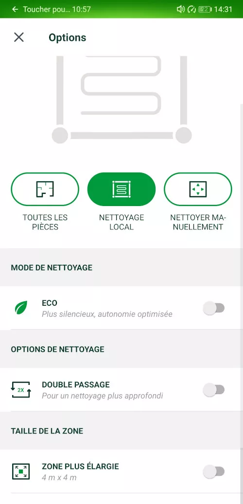 Comme vous pouvez le voir il est possible de doubler la zone de nettoyage et de demander au robot de faire 2 passages.