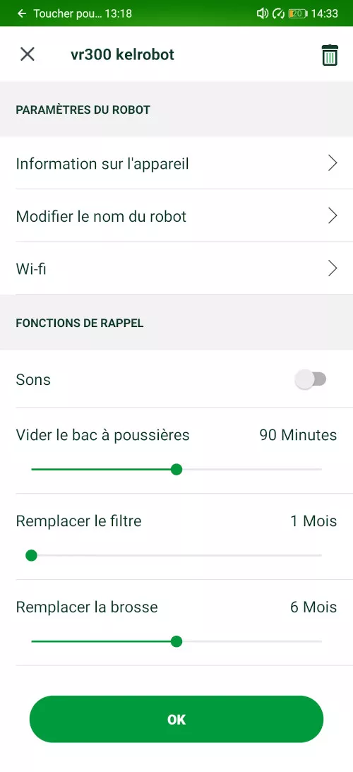 Pour terminer ce tour d’horizon de l’application, sachez qu’il est possible de désactiver les sons émis par le robot qui sont assez désagréables. Il émet un son par exemple quand vous le retournez, quand il est coincé ou encore quand vous enlevez la brosse.
