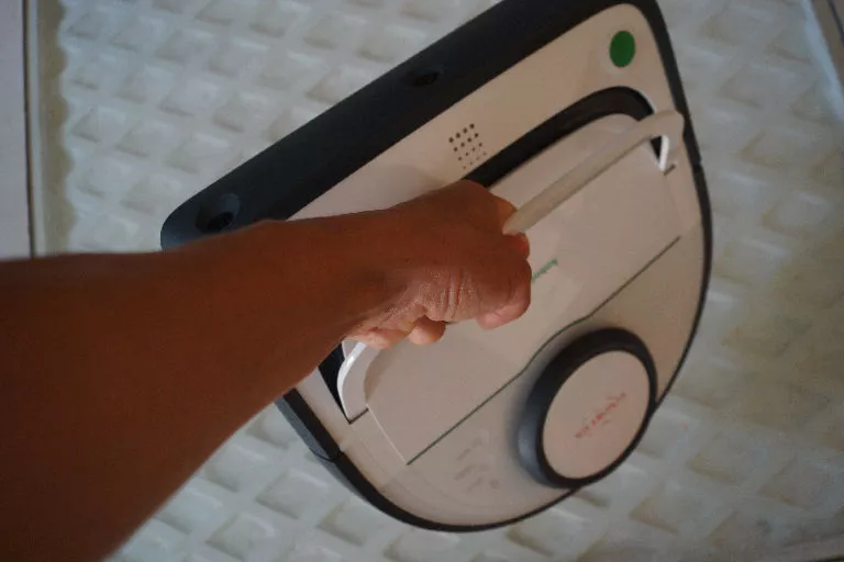 Il pèse 5 kg ce qui en fait un des robots les plus lourds du marché. Heureusement Vorwerk a intégré une poignée pour saisir le robot :